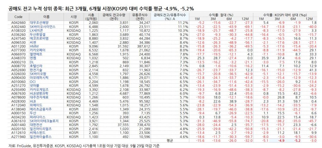 8일 유진투자증권이 코스피와 코스닥 시가총액 1조원 이상 기업 중 유통주식 대비 공매도 잔고 누적이 가장 많은 종목을 살펴본 결과, 잔고 상위 30종목의 주가는 최근 3개월과 6개월 주가가 코스피 대비 5% 부진했다. 최근 한 달간 실적만 놓고 보면 10개 기업 중 73%가 코스피 수익률을 밑돌았다.