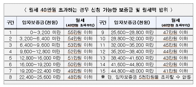 중개수수료와 이사비 신청 대상은 가구당 기준 중위소득 120% 이하의 무주택 청년으로 임차보증금 5000만 원 이하, 월세 40만 원 이하의 주택이면 신청이 가능하다. 다만 월세가 40만 원을 초과하더라도 보증금의 월세 환산액(주택임대차보호법에 따라 환산율 3.75% 적용)과 월세액을 합산한 금액이 55만 원 이하면 신청할 수 있다. 가족과 함께 거주하더라도 청년이 주민등록등본상 세대주이며 임대차계약서의 임차인 본인이라면 지원 가능하다.