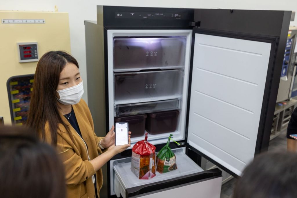 '제조일자가 안 적힌 김장김치 등은 어떻게 관리하냐'는 현장 취재진 질문에 이슬기 LG전자 물·식품과학연구소 연구원은 "LG 냉장고 중칸에 적힌 김치 유산균 '류코노스톡' 탭에서 김치를 담근 날짜를 적으면 포장김치 AI 관리 체계처럼 고객이 직접 김치를 관리할 수 있다"고 했다.
