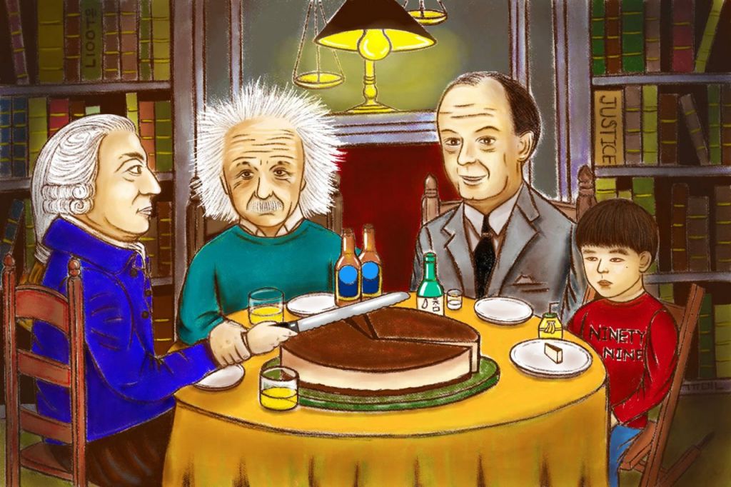 공정분배란 무엇일까? 케이크 나누는 물리학자와 경제학자, 어린이. 연구진은 분배 문제에 물리학 원칙을 적용하는 의미를 나타낸 연구 관련 그림으로 소개했다.