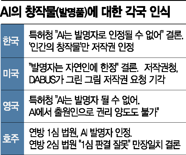 이러한 특허청의 판단에는 글로벌 흐름도 반영됐다. 앞서 미국 특허청은 2020년 탈러 씨의 특허 출원 요청에 대해 "발명자는 자연인에 한정한다"고 거절했고, 영국에서도 "AI가 발명자가 될 수 없고, AI에서 출원인으로 권리 양도도 불가능하다"고 결론지었다.