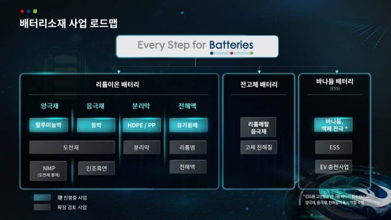 롯데그룹은 화학군 내 회사들을 통해 다양한 전지소재사업에 적극 투자하고 있다. 롯데케미칼, 롯데정밀화학, 롯데알미늄과 함께 배터리 4대 소재(양극재, 음극재, 전해액, 분리막)에 직간접적으로 투자?생산을 진행하고 있다.