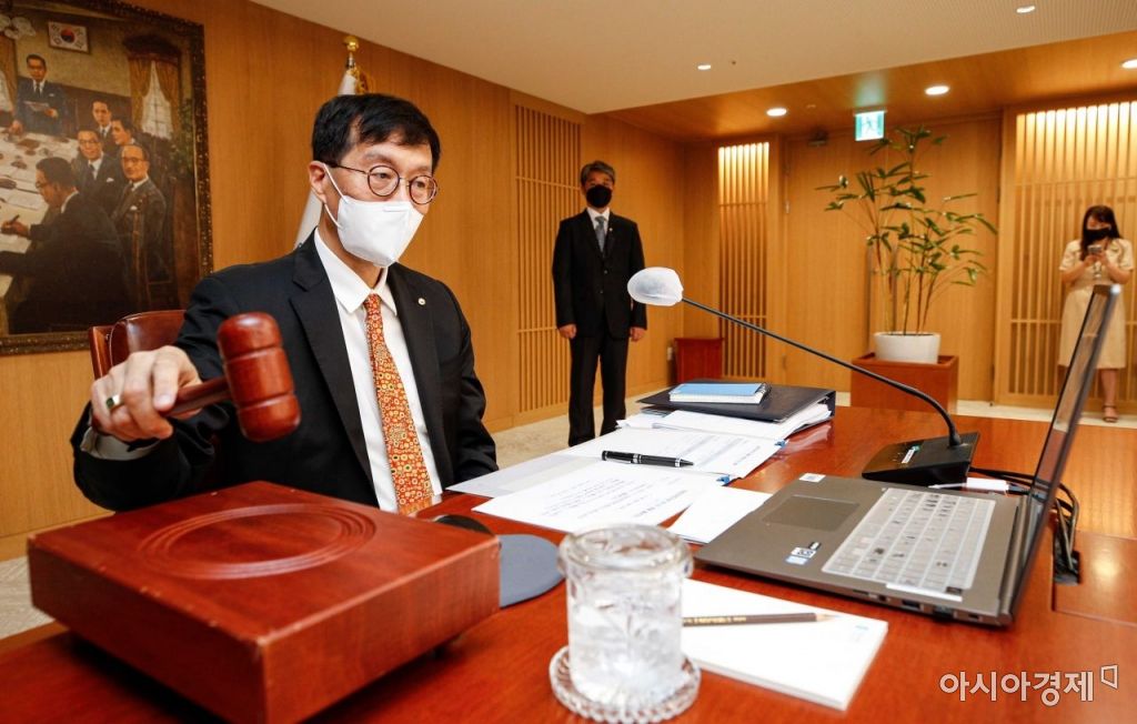 이창용 한국은행 총재가 13일 서울 중구 한국은행에서 열린 금융통화위원회 본회의에서 의사봉을 두드리고 있다./강진형 기자aymsdream@