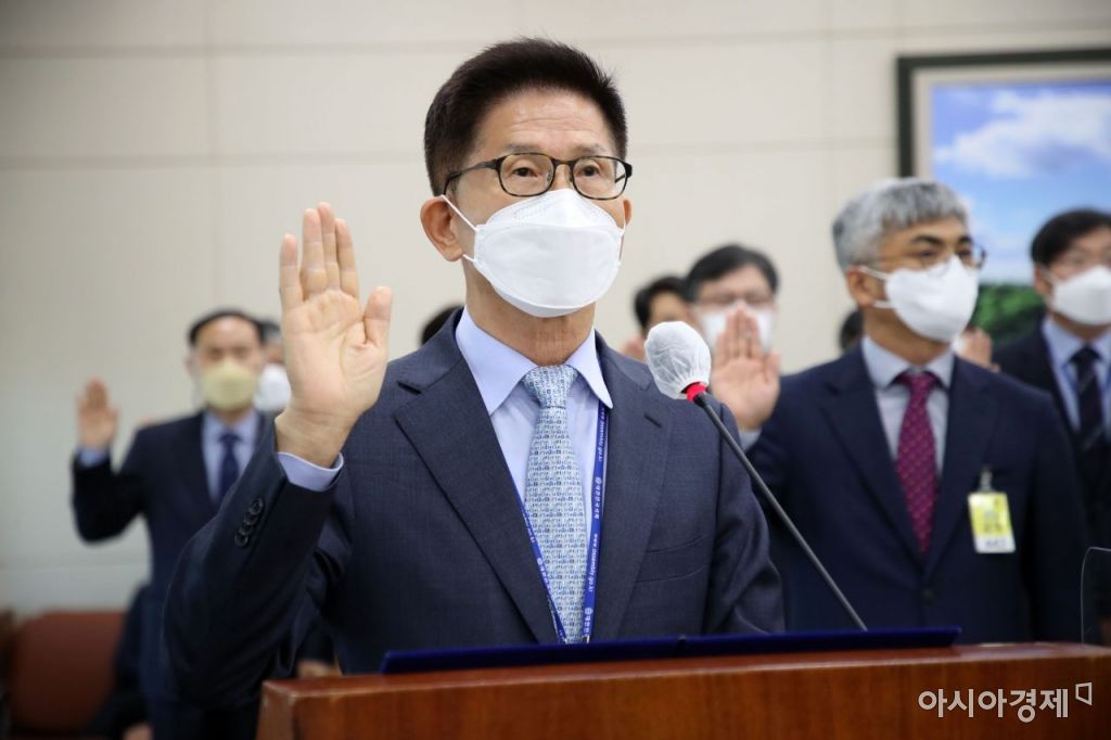 김문수 경제사회노동위원장이 12일 국회에서 열린 경제사회노동위원회 등에 대한 국정감사에 출석, 증인선서를 하고 있다./윤동주 기자 doso7@