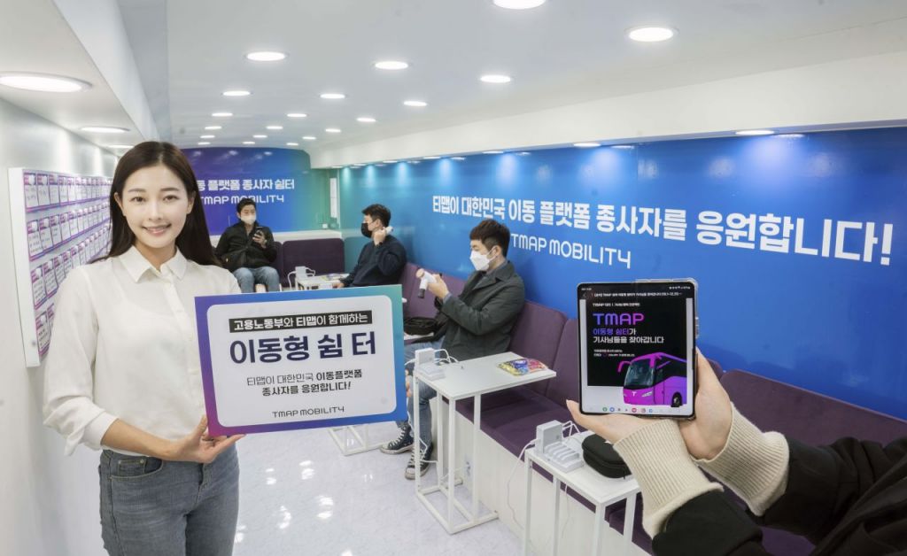 티맵이 배달·대리기사 등 이동 플랫폼 종사자라면 누구나 이용 가능한 ‘TMAP 이동형 쉼터’ 문을 열었다고 13일 밝혔다. 사진=티맵모빌리티