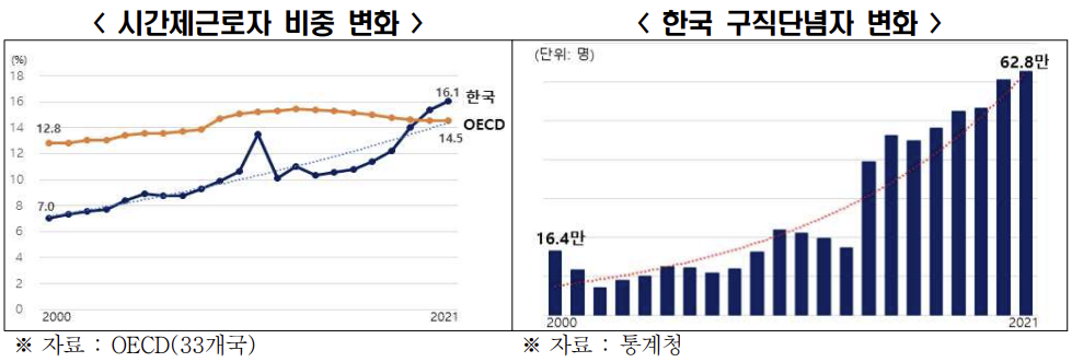 다만 실업률 순위 상승이 지표로는 개선 효과가 있어도 체감 고용 상황과는 거리가 있다는 게 전경련 설명이다. 실제 국민이 피부로 느끼는 체감 실업률은 2017년 11%에서 지난해 13.3%로 늘었다. 비자발적 시간제 근로자 등 구직자가 선호하지 않는 일자리가 늘어난 탓이다. 특히 비자발적 시간제 근로자는 지난해 기준 전체 시간제 근로자의 40.1% 비중을 차지해 OECD 33개국 평균(21.0%)을 넘어 세계에서 가장 높은 수준을 기록했다. 구직을 포기한 구직 단념자 역시 2000년 16만4000명에서 지난해 62만8000명으로 늘었다.