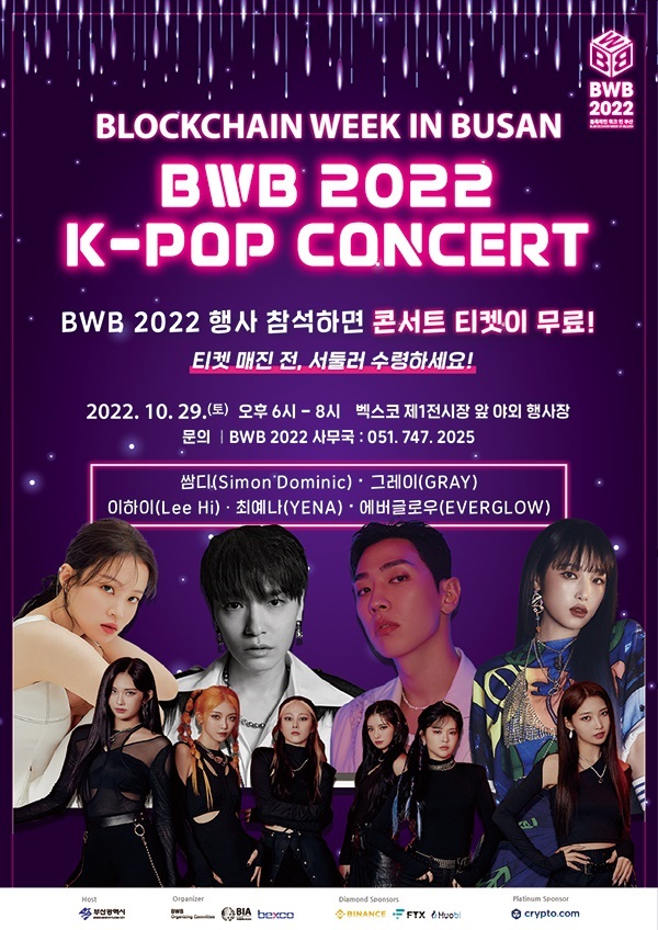 행사에는 K-POP 콘서트뿐만 아니라 바이낸스·FTX·후오비 등 국내외 연사들이 참여하는 콘퍼런스와 작가 특별전, NFT 갤러리·옥션, 기업별 밋업 등 다양한 프로그램이 마련돼 있다.