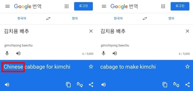 [아시아경제 김정완 기자] 구글이 구글 번역기에 '김치용 배추'를 영어로 번역했을 때 나오던 ‘Chinese(중국)’를 삭제한 것으로 확인됐다.