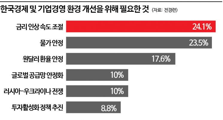 24일 아시아경제가 전국경제인연합회와 공동으로 국내 매출액 100대 기업을 대상으로 한 경제경영환경을 조사한 결과 '한국경제 및 기업경영 환경 개선을 위한 주요 변수로 '금리 인상 속도 조절'이 24.1%로 가장 높게 조사됐다. 이어 물가 안정(23.5%), 환율 안정(17.6%), 글로벌 공급망 안정화와 러시아-우크라이나 전쟁(각 10%) 등의 순이다.