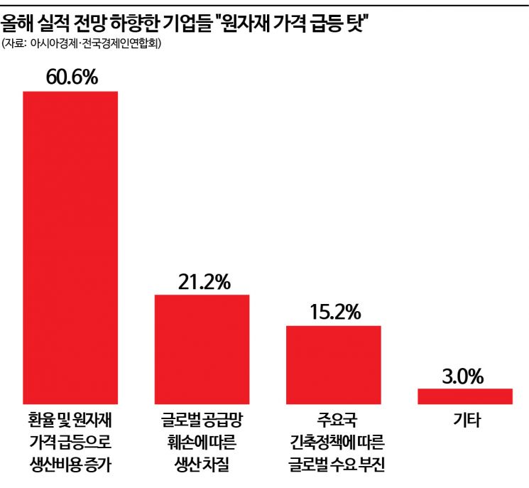 24일 아시아경제가 전국경제인연합회와 공동으로 국내 매출액 1000대 기업을 대상으로 한 경제경영환경 조사에 따르면, '연초 대비 올해 실적 전망치를 하향한 응답자를 대상으로 하향한 이유'에 대해 응답기업(33개)의 60.6%가 '환율 및 원자재 가격 급등으로 생산비용 증가'를 꼽았다.