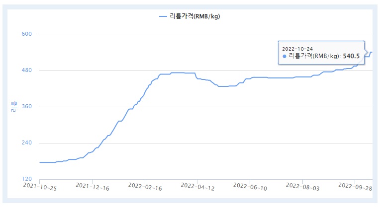 25일 한국자원정보서비스에 따르면 리튬(탄산 리튬 99%기준) 가격은 전날 기준 ㎏당 540.5위안으로 역대 최고가를 기록했다. 지난해 10월 ㎏당 175.5위안이던 리튬 값은 1년 사이 3.1배 올랐다. 특히 지난 일주일간 525.5위안으로 보합세를 보이던 리튬 가격은 하루만에 2.85% 급등하며 올해 1월 6일(2.99%↑) 이후 두 번째로 오름폭이 컸졌다.