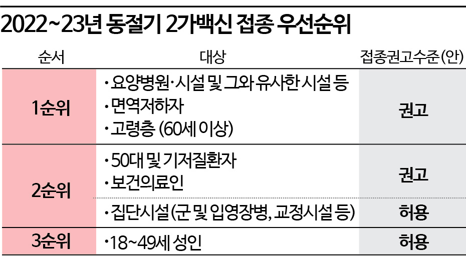 이에 따라 기존 1순위 대상자와 50대, 기저질환자, 보건의료인을 포함한 2순위에겐 접종을 권고하고, 18~49세 성인에겐 권고 수준은 아니나 본인이 원할 경우 접종을 허용했다. 단, 개량백신을 맞기 위해서는 마지막 접종 혹은 확진일 기준 4개월(120일)이 지나야 한다. 예약은 기존처럼 사전예약시스템 홈페이지, 1339 콜센터, 주민센터 등에서 가능하며, 고령층 등은 가족 대리예약도 가능하다. 네이버·카카오 플랫폼을 통한 잔여백신 예약서비스로 당일접종도 할 수 있다.