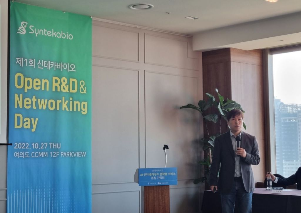 정종선 신테카바이오 대표가 27일 여의도 CCMM빌딩에서 열린 간담회에서 자사의 AI 신약 클라우드 플랫폼인 '에스티비 클라우드(STB CLOUD)'를 설명하고 있다./사진=김영원 기자