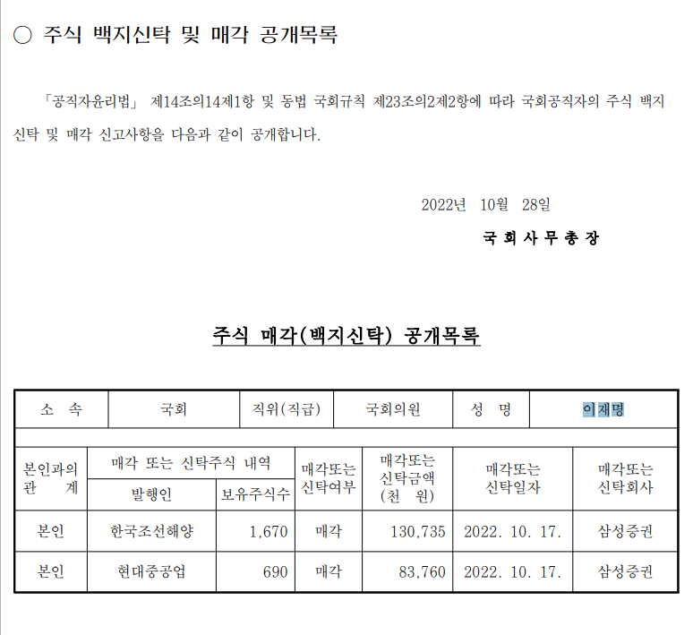 28일 국회 공보에 따르면 이 대표는 보유하고 있던 한국조선해양 1670주와 현대중공업 690주를 전량 매각했다. 매각 대금은 2억1449만5000원으로 국회의원 재산공개 내역에 있던 취득금액 2억3125만원보다 1675만5000원이 낮다.