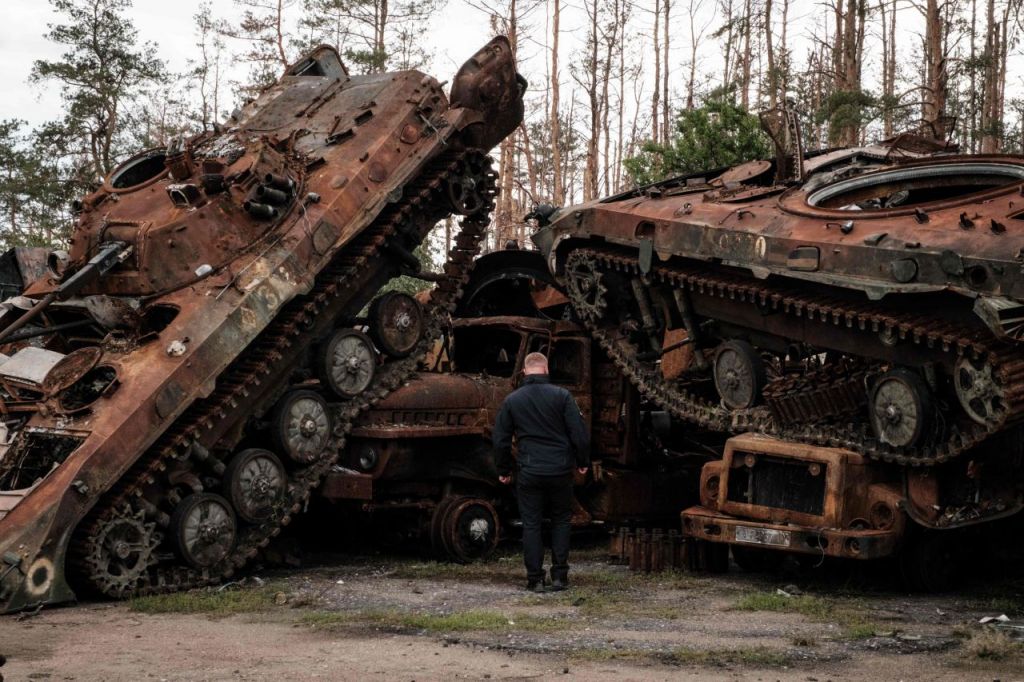 우크라이나 동부 도네츠크주 리만에서 한 경찰관이 폐차된 러시아군 장갑차들을 바라보고 있다. 사진=AFP연합뉴스