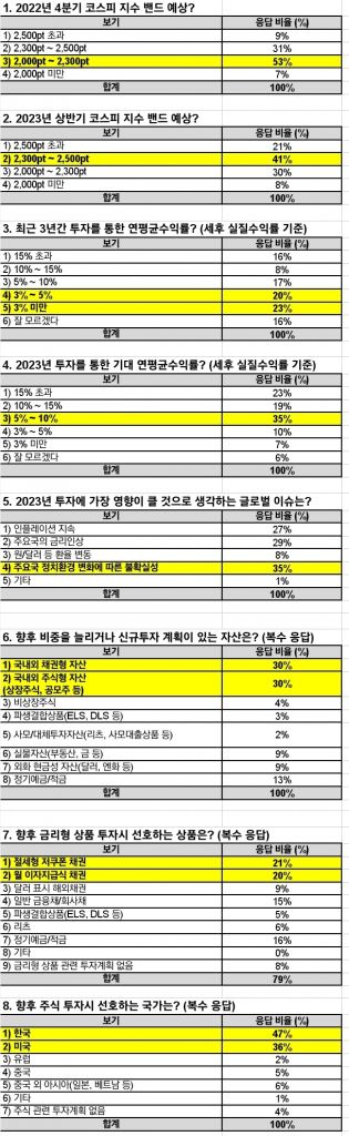 큰손들은 내년에 두마리 토끼를 잡을 계획을 세우고 있다. 그 중 하나가 바로 한국 주식 시장이다. 한국 주식 시장의 저평가 매력을 느껴 저가 매수에 나설 채비를 하고 있는 것이다. 향후 주식 투자시 선호 국가로 '한국(47%)'이 '미국(36%)'을 제치고 1위를 한 설문 결과와도 부합한다. 이들은 국내 증시가 4분기에 저점(바닥)을 찍고 내년에는 회복(상승)을 할 수 있을 것으로 보고 있다. 4분기 코스피 예상 밴드로는 2000~2300을 예상하는 이들이 53%로 가장 많았고, 내년 상반기에는 2300을 초과할 것이라는 전망이 62%에 달했다. 올해 코스피가 4분기 바닥을 찍고 상승할 것으로 보는 시각이 짙다는 의미다.