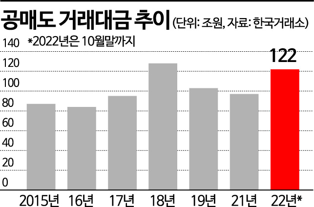 공매도 거래대금은 관련 통계가 집계되기 시작한 2009년 14조원대에서 2015년 87조원, 2017년 95조원 등 해마다 급증했다. 2018년에는 처음으로 100조원을 돌파하면서 128조원을 기록했다. 2019년에도 103조원에 달하는 등 100조원대를 유지했다. 2020년에는 코로나19로 인해 공매도가 금지됐다. 올해 4분기에 공매도가 지속해서 늘어나 128조원을 상회하면 사상 최대 기록을 세우게 된다.