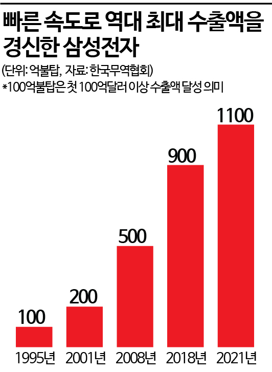 삼성전자는 그간 반도체 사업을 주력으로 국내 수출 성장을 주도했다. 메모리 반도체 분야에서 선제 기술을 선보이며 세계 반도체 시장에서 1, 2위를 다투는 주요 사업자로 거듭난 결과, 1995년 국내 기업으로는 처음으로 수출액이 100억달러를 넘기는 기록을 세웠다. 이후 2018년에는 900억달러를 넘기더니 3년 만인 지난해에는 1100억달러 벽을 처음 넘겼다.