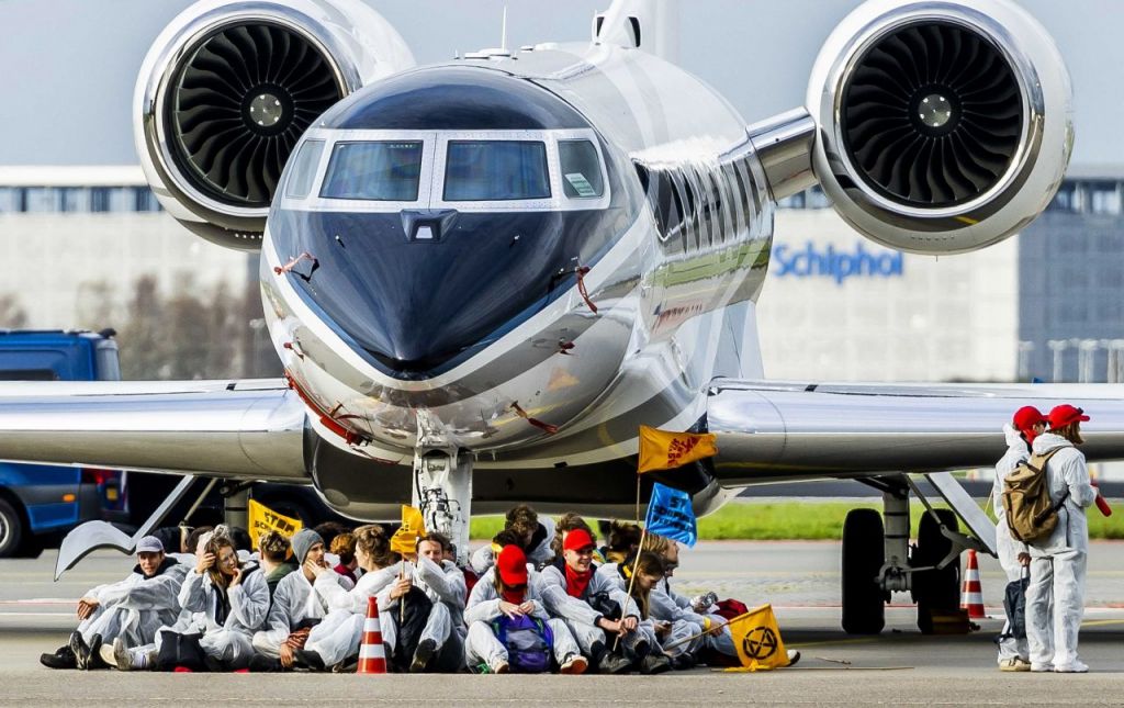 5일(현지시간) 주요 외신들에 따르면 이날 그린피스와 '멸종 저항(Extinction Rebellion·XR)' 회원 수백명으로 이뤄진 시위대가 네덜란드 암스테르담 스히폴 공항의 전용기 구역을 점거했다. 스히폴 공항은 네덜란드를 대표하는 허브 공항으로, 3개의 터미널을 가지고 있는 대규모 공항이다. 흰색 작업복 상·하의 차림의 시위대는 전용기 이륙을 방해하기 위해 항공기 바퀴 앞에 앉아 시위를 벌였으며, 이 때문에 전용기 몇대의 이륙이 지연됐다.
