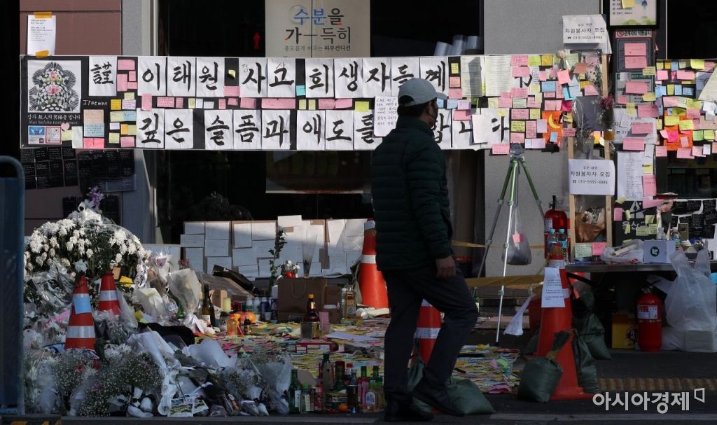 7일 서울 용산구 이태원역 1번 출구 앞 참사 추모 공간을 찾은 시민들이 희생자를 추모하고 있다. 사진=김현민 기자 kimhyun81@
