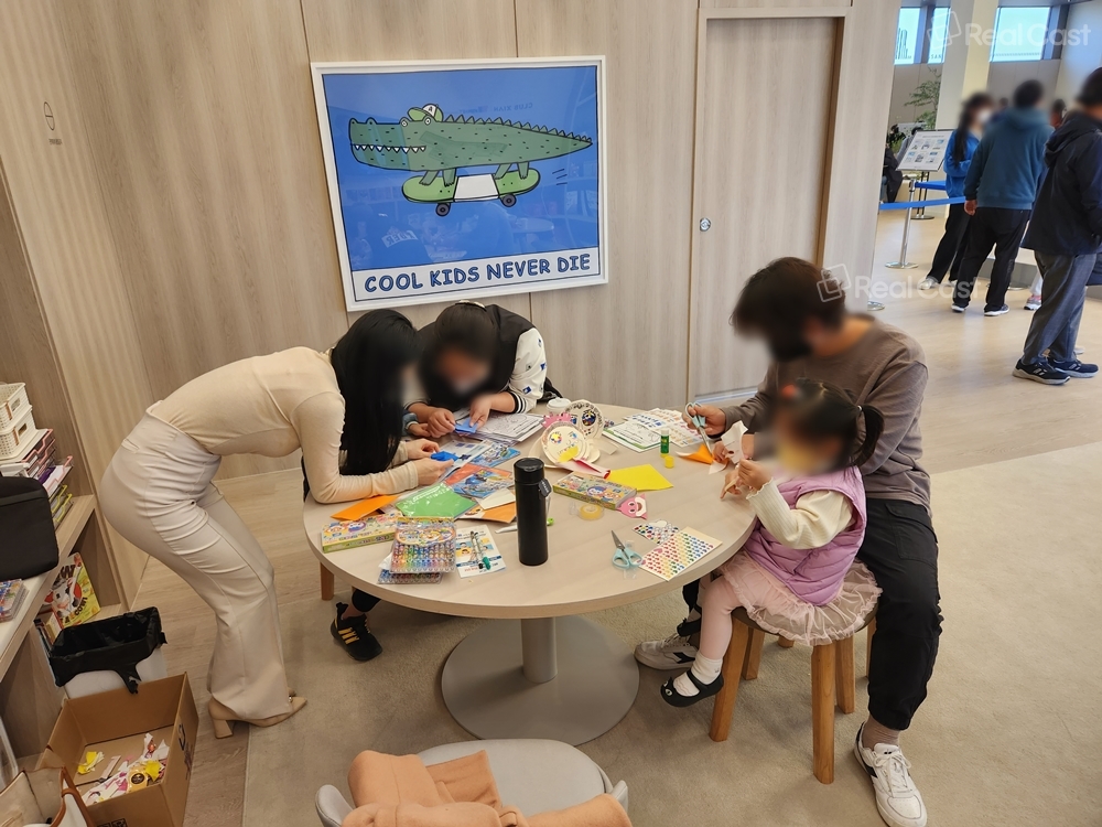 특히 아산자이 그랜드파크만의 커뮤니티 프로그램을 직접 체험해 볼 수 있는 부스가 인기를 얻고 있다. 아산자이 그랜드파크에 조성되는 ‘OCS(Open Coffee Station)’를 그대로 옮겨온 듯한 카페테리아에서는 방문객들이 커피를 마시며 견본주택 한켠에서 여유를 즐기는 모습이다. 부모님을 따라서 온 아이들은 YBM 영어 도서관 부스와 교보문고 큐레이션 도서관 부스에 흥미를 보였다. 영어책에 흥미를 보이며 ‘YBM 리딩 팜(YBM Reading Farm)’ 프로그램을 체험하는 아이가 있는가 하면, 교보문고에서 선별한 책을 집중해 읽고 있는 아이들도 많아 도서관을 방불케 했다.