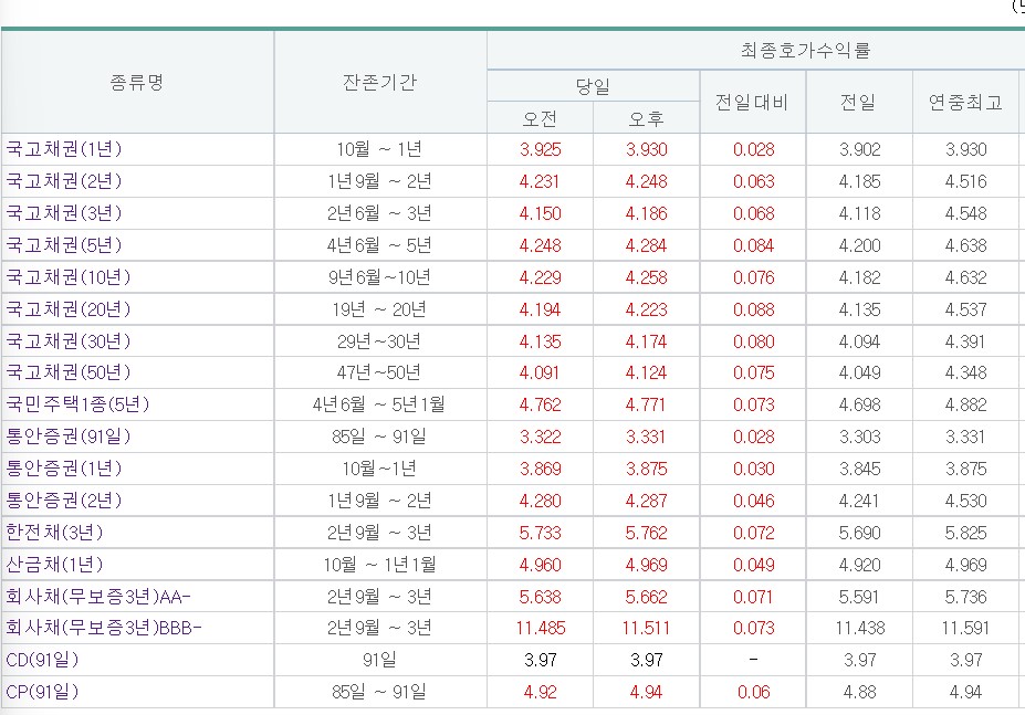 한편, CD 금리는 연 3.97%로 보합을 보였고, CP 금리는 전 거래일보다 0.06%p 상승한 연 4.94%로 마치며 연고점을 다시 썼다.