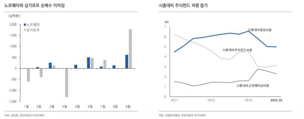 외인의 순매수도 눈에 띈다. 미국과 중국 간 갈등이 커지면서 글로벌 자산을 배분하는 투자자들은 중국 비중을 축소하는 것에 대한 고민이 커진 상태다. 이른바 ‘차이나 런’인데, 이에 따른 국내 증시 수급도 빠질 것을 걱정했으나 오히려 자금이 들어오고 있다. 일례로 미국의 텍사스 연금(TRS)는 중국 투자 비중을 35%에서 17%로 줄이고, 감소분을 나머지 신흥국에 배분하기로 결정한 바 있다. 또 러시아-우크라이나 전쟁 장기화에 따라 국내 투자 비중 확대 가능성도 커졌다.