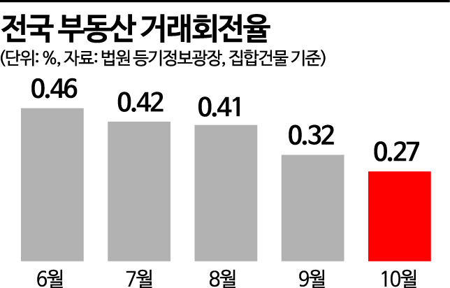 8일 법원 등기정보광장에 따르면 지난달 전국의 아파트 등 집합건물의 거래회전율은 0.27%로 집계됐다. 이는 전달(0.34%)보다 0.07%포인트 줄어든 것으로, 2010년 조사를 시작한 이후 가장 낮았다.