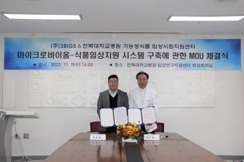 전북대병원 임상연구지원센터에서 진행된 협약식에서 양 기관은 쓰리빅스의 축적된 바이오 빅데이터 및 마이크로바이옴 분석 기술과 기능성식품임상시험지원센터의 식품 임상에 대한 기술을 기반으로 글로벌 식품인증에 대한 연구 및 시스템 구축을 공동 추진하기로 합의했다.