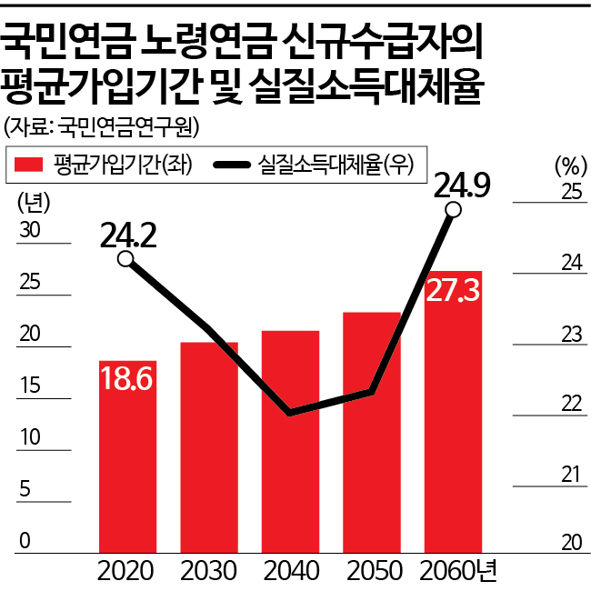 정 부연구위원에 따르면 2020년 기준 노령연금 신규 수급자의 평균 가입기간은 18.6년, 실질 소득대체율은 24.2%였다. 낮은 실질 소득대체율 탓에 2019년 노령연금 평균 급여액은 52만원이며, 여기에 기초연금 23만6000원을 합쳐도 근로자 평균소득의 19.7% 수준에 불과했다.