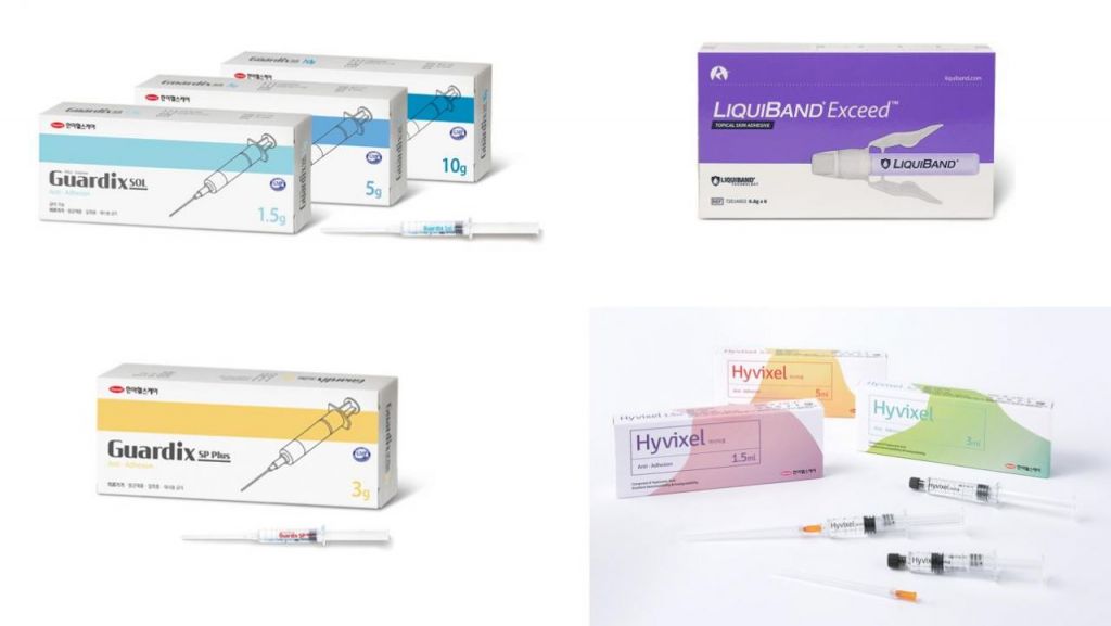 한미사이언스가 한미헬스케어 합병으로 확보하게 된 주요 제품들. 유착방지제 ‘가딕스’, 수술 후 피부봉합 치료재료 ‘리퀴밴드’, 유착방지제 ‘하이빅셀’, 기존 가딕스의 성능을 높인 ‘가딕스-SP Plus’.[사진제공=한미사이언스]