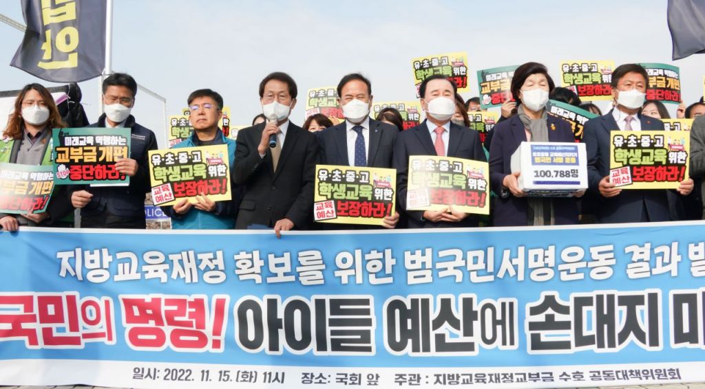 지방교육재정교부금 수호 공동대책위원회가 15일 국회 앞에서 교부금 개편에 반대하는 범국민서명운동 결과를 발표하는 기자회견을 진행했다. (사진출처=연합뉴스)