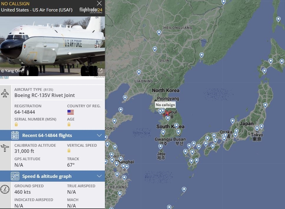 17일 플라이트레이더24 등 항공기 추적 사이트에 따르면 이날 오후 미 공군의 정찰기 RC-135V '리벳조인트'가 중부지방 상공을 서쪽에서 동쪽으로 비행하는 항적을 노출했다. 미 공군의 주력 통신감청 정찰기인 RC-135V 출격은 북한의 추가 도발 움직임을 감사하려는 목적으로 분석된다.