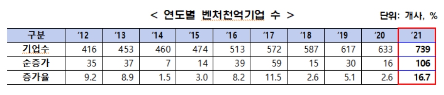 중소기업벤처부는 ‘2021년도 기준 벤처천억기업 실태조사 결과’를 21일 발표했다. 지난해 매출액 1000억원 이상을 달성한 벤처기업은 739개사로 전년(633개사)대비 16.7%(106개사) 증가했다. 이는 최근 10년 내 가장 큰 증가율이다.