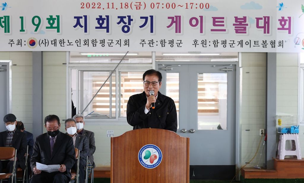 이상익 함평군수가 게이트볼대회에서 축사를 하고 있다.