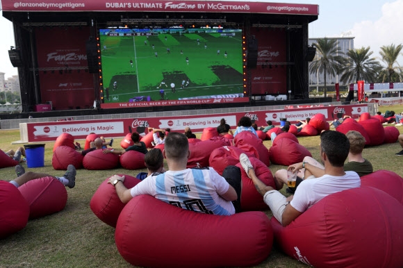 아르헨티나 축구대표팀 유니폼을 걸친 이들을 포함해 축구 팬들이 22일(현지시간) 두바이에 마련된 팬 존에 모여 카타르월드컵 조별리그 C조 아르헨티나와 사우디아라비아의 경기 중계를 즐기고 있다. 사진=AP연합뉴스