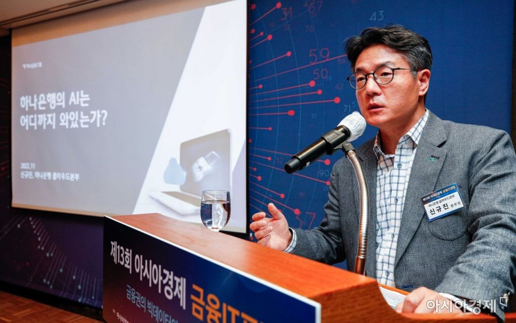 신규진 하나은행 클라우드본부장이 24일 서울 중구 롯데호텔에서 열린 '제13회 아시아경제 금융 IT포럼'에서 '하나은행의 AI는 어디까지 와있는가?'란 주제로 발표하고 있다./강진형 기자aymsdream@