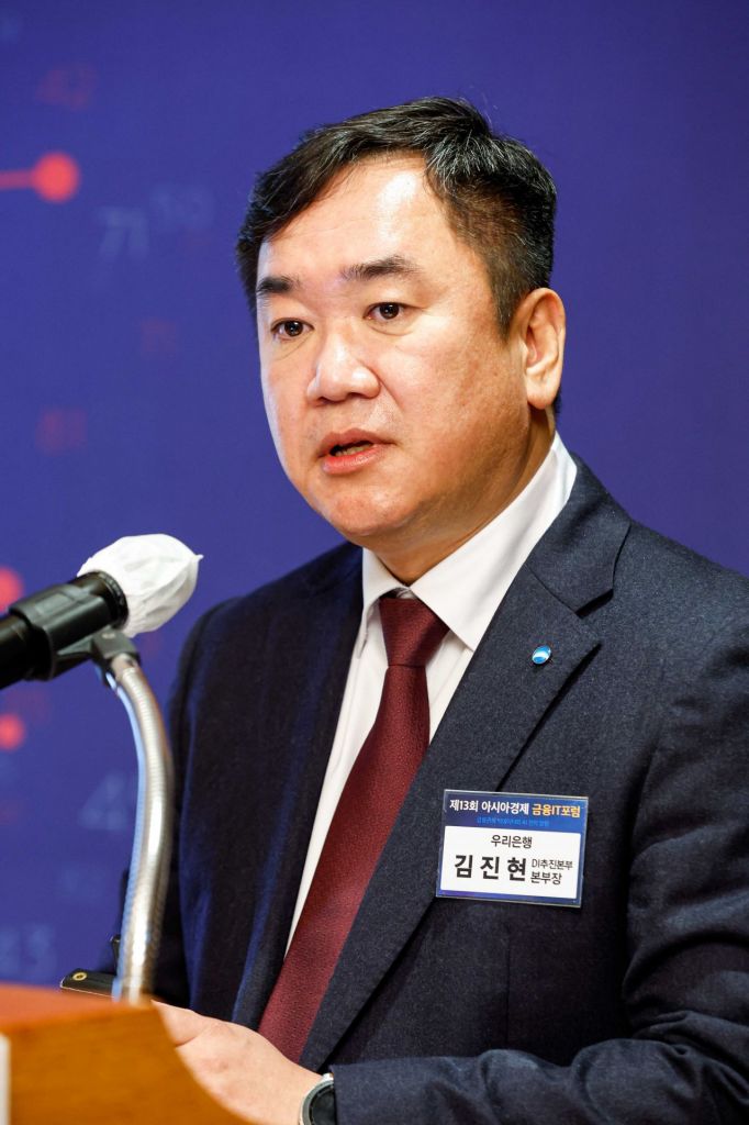 김진현 우리은행 DI추진본부장이 24일 서울 중구 롯데호텔에서 열린 '제13회 아시아경제 금융 IT포럼'에서 '데이터와 AI로 만들어 가는 미래 은행'이란 주제로 발표하고 있다./강진형 기자aymsdream@