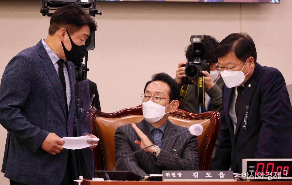 김도읍 국회 법사위원장이 2일 국회에서 열린 법사위 전체회의에서 기동민 더불어민주당 간사, 정점식 국민의힘 간사와 이야기를 나누고 있다./윤동주 기자 doso7@
