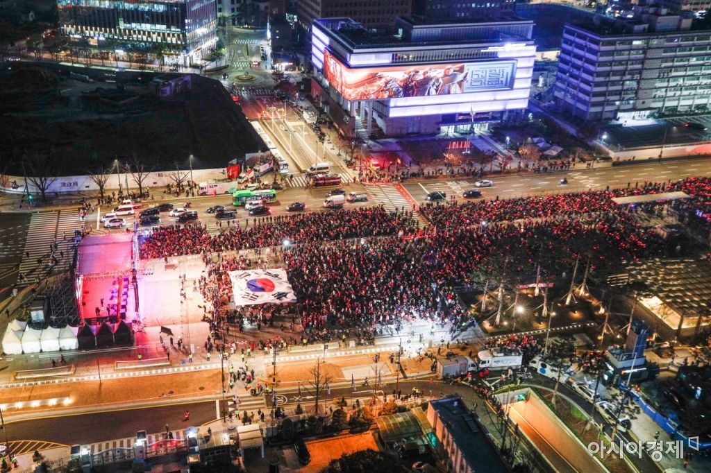 2022 카타르 월드컵 대한민국과 우루과이 경기가 시작된 24일 서울 종로구 광화문 광장에 모인 응원단이 태극기를 펼치고 있다./강진형 기자aymsdream@