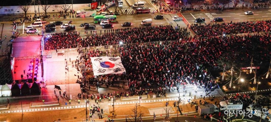 2022 카타르 월드컵 대한민국과 우루과이 경기가 시작된 24일 서울 종로구 광화문 광장에 모인 응원단이 태극기를 펼치고 있다./강진형 기자aymsdream@