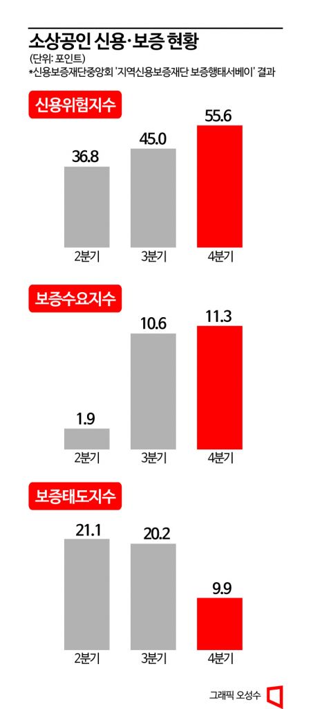 소상공인들의 신용리스크는 올라가고 보증 수요는 늘어나다 보니 보증 심사 과정은 더 까다로워졌다. 심사 정도를 나타내는 '보증 태도 지수'는 2분기 21.1포인트에서 3분기 20.2포인트로 떨어졌고, 4분기에는 9.9포인트까지 급격히 하락할 것으로 전망됐다. 보증 태도 지수는 수치가 하락할수록 보증 심사가 강화된다는 것을 의미한다.