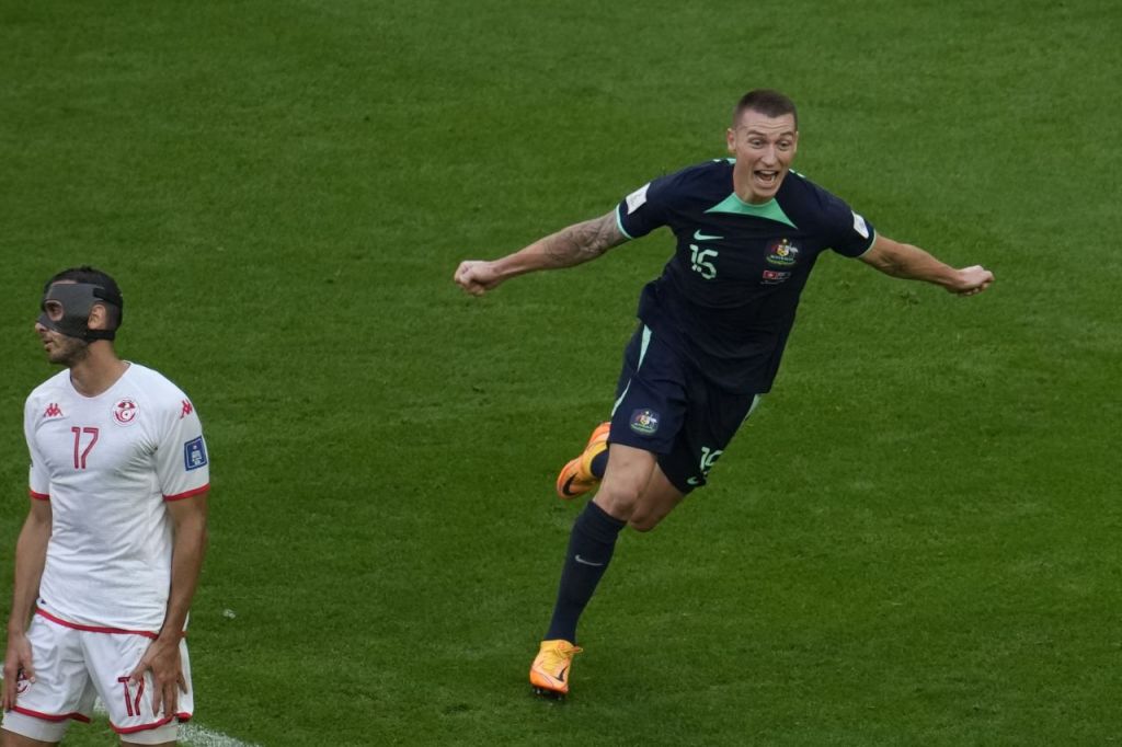 호주의 미철 듀크가 26일 카타르 알와크라 알자눕 스타디움에서 열린 튀니지와의 2022 국제축구연맹(FIFA) 카타르 월드컵 D조 조별리그 2차전, 전반 23분에 헤더로 득점한 뒤 기뻐하고 있다. [이미지출처=AP연합뉴스]