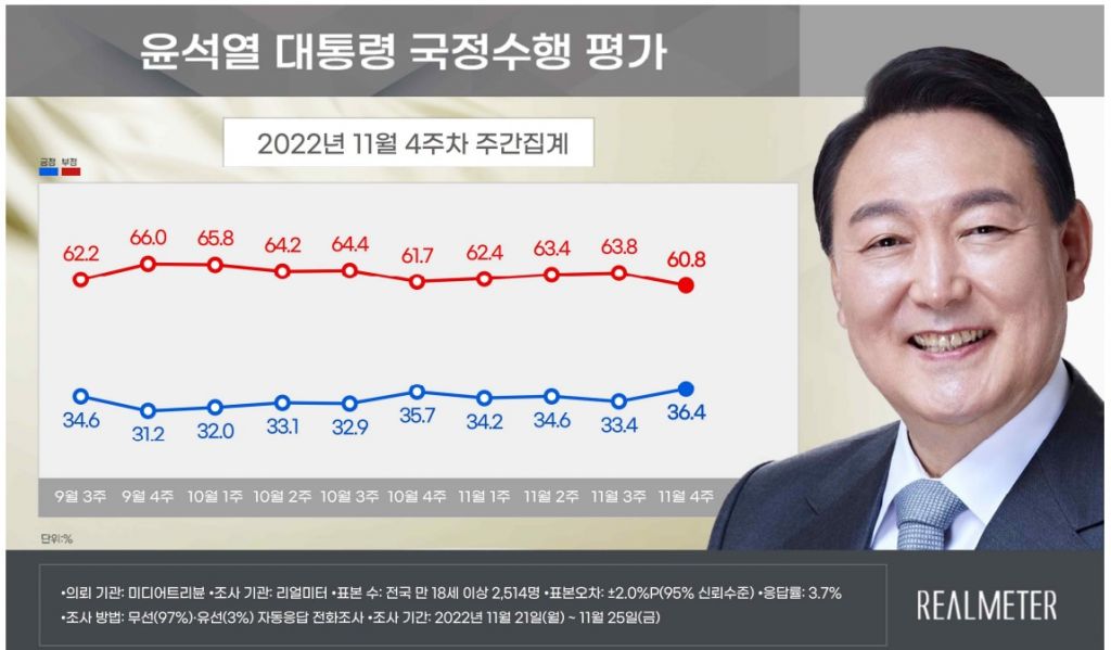28일 리얼미터가 미디어트리뷴 의뢰로 지난 21일부터 25일까지 전국 만 18세 이상 유권자 2514명을 대상으로 조사한 결과, 윤 대통령의 국정수행 긍정 평가는 36.4%, 부정 평가는 60.8%로 나타났다.