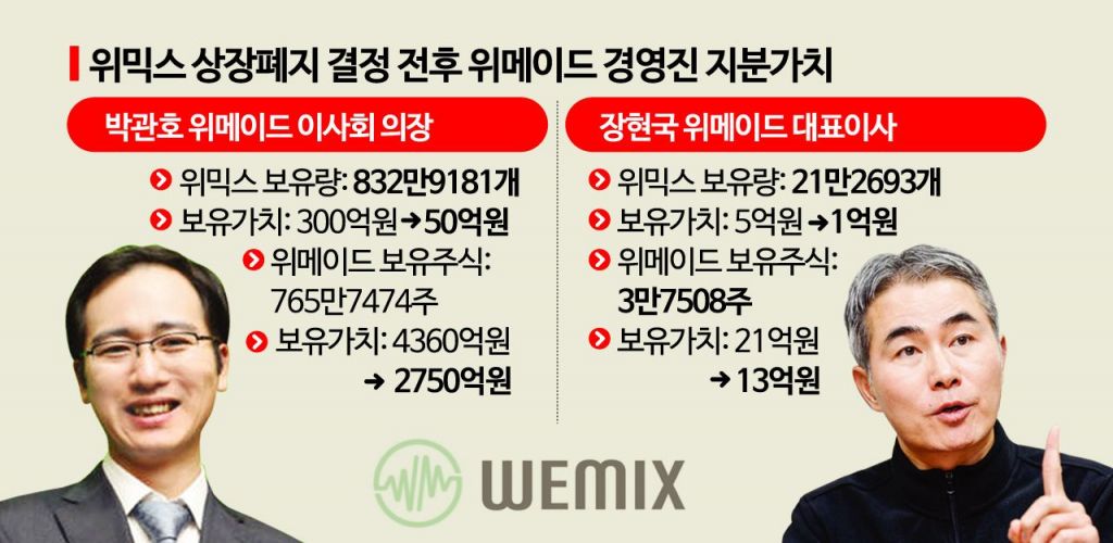 36만주 가량을 보유한 장 대표의 손실도 불가피하다. 장 대표가 보유가 위메이드 주식 가치는 위믹스 상폐 결정 전 200억원에서 130억원으로 감소했다.