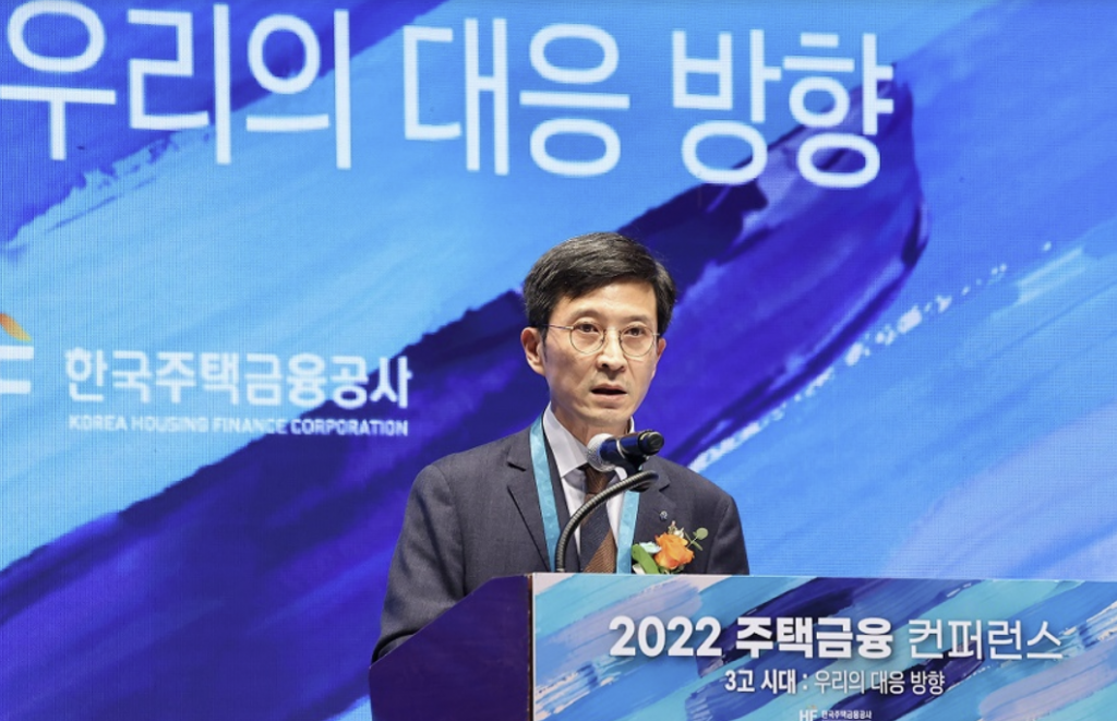 최준우 주택금융공사 사장이 28일 서울 소공동 웨스틴 조선호텔에서 ‘3고 시대, 우리의 대응방향‘을 논의하기 위해 열린 ‘2022 주택금융 컨퍼런스’에서 개회사를 하고 있다.