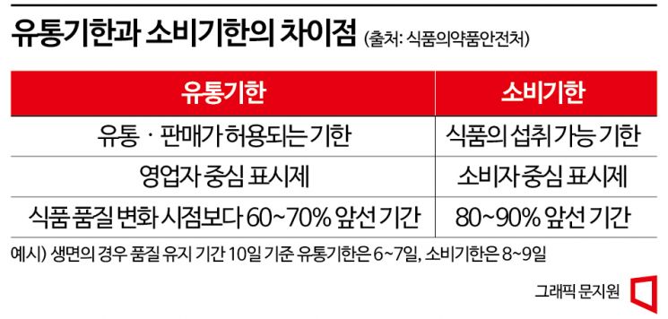 식약처는 도입 배경에 대해 "유통기한이 지난 제품에 대한 섭취 여부를 고민하거나, 유통기한을 폐기 시점으로 인식하는 등 소비자 혼란이 계속됐다"며 "정확한 정보를 제공하고 이로 인해 버려지는 식품 폐기물을 감소하기 위해 소비기한을 도입하게 됐다"고 설명했다. 그동안 쓰여왔던 유통기한은 유통과 판매가 허용되는 ‘팔아도 되는’ 기간이며, 소비기한은 식품의 섭취가 가능한 ‘먹을 수 있는 기간’으로 차이가 있다. 식약처에 따르면 흔히 소비자들이 ‘상했다’라고 여기는 식품 품질 변화 시점을 기준으로 유통기한은 60~70% 앞선 기간을, 소비기한은 80~90% 앞선 기간을 설정한다. 소비기한이 유통기한보다 대략 20~50% 긴 셈이다.