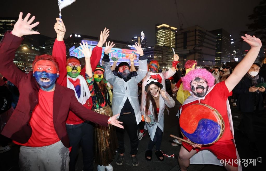 2022 카타르 월드컵 한국과 가나의 경기가 열린 28일 서울 종로구 광화문 광장에 모인 붉은악마와 시민들이 열띤 거리응원을 펼치고 있다./김현민 기자 kimhyun81@
