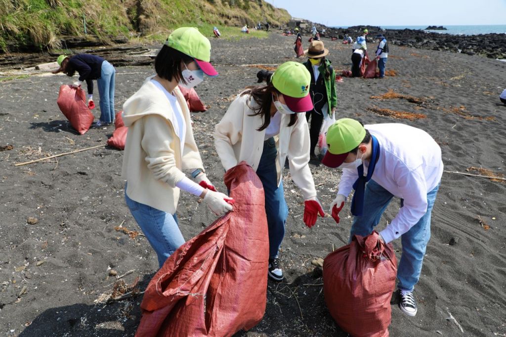 진에어 직원들이 지난 4월 제주도 수월봉 인근 해안에서 정화 활동을 수행하고 있다.<사진제공:진에어>