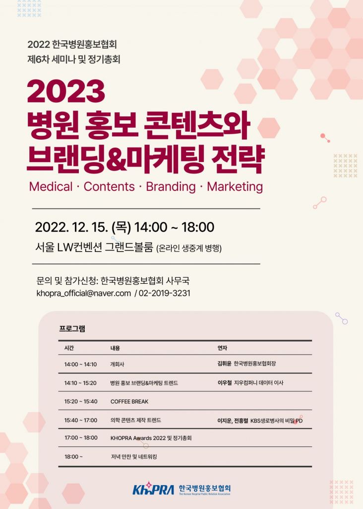'2023 병원 홍보 콘텐츠와 브랜딩 & 마케팅 전략'을 주제로 열리는 이번 6차 세미나에서는 새해 병원 홍보 환경에 대해 살피고 콘텐츠, 브랜딩, 마케팅 등 병원 홍보 모든 영역에 관한 솔루션을 살필 예정이다.